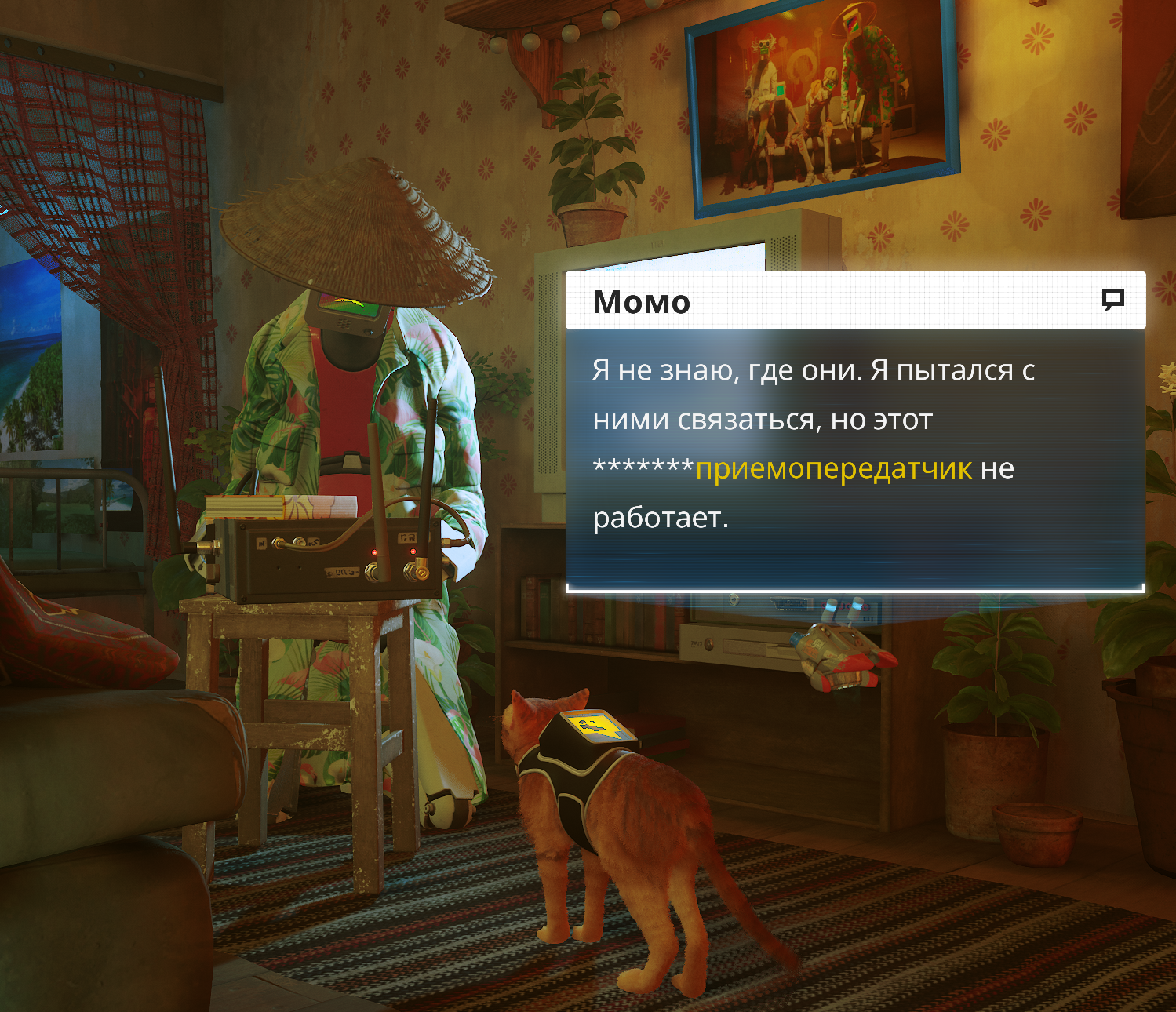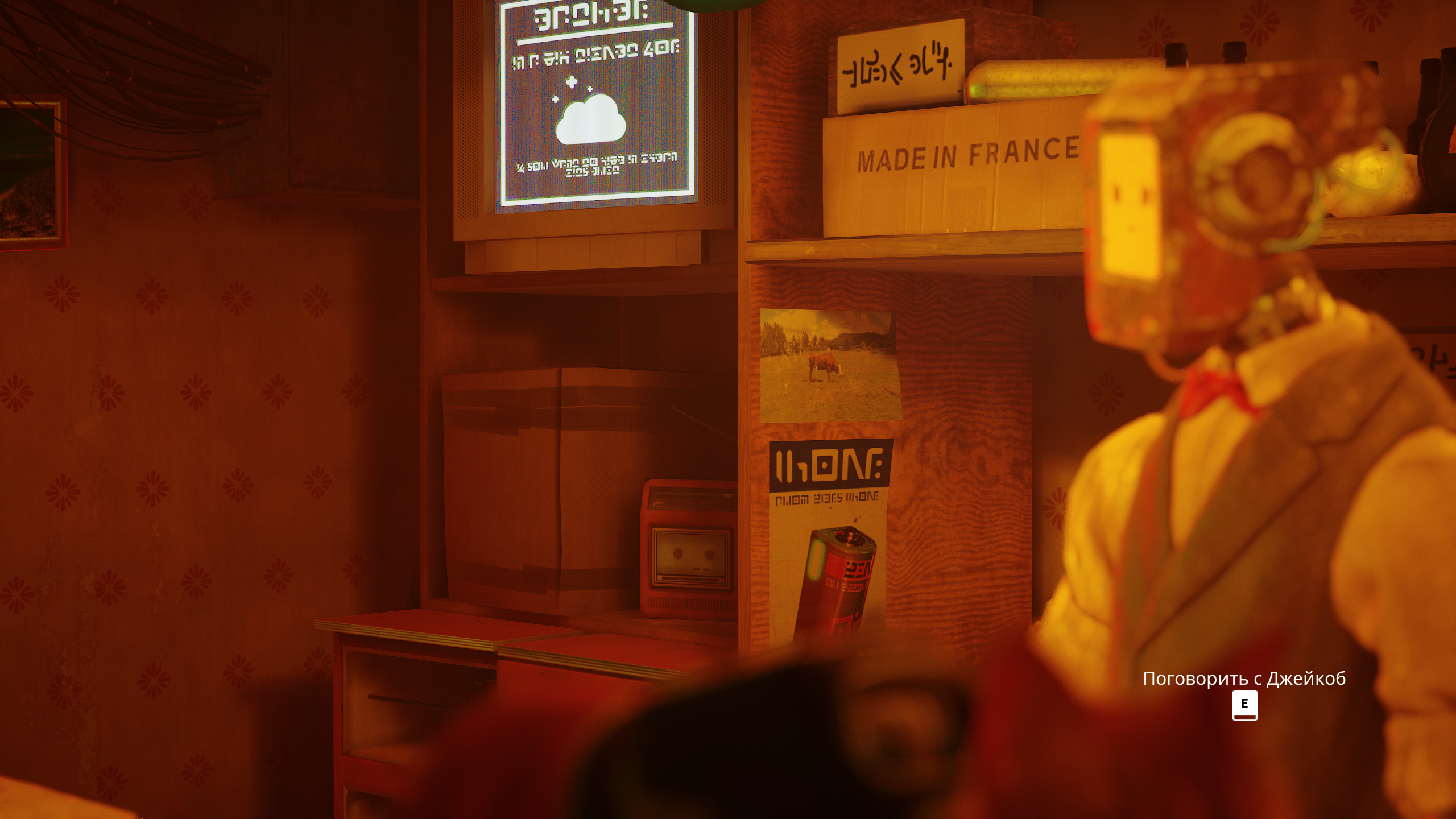 Кошачья игра Stray разработана командой с юга Франции, состоящая главным образом из котов -)) и нескольких людей в придачу -)), и в игре в некоторых местах можно обнаружить коробки, повествующие о местонахождении создателей игры, при этом рядышком мы снова можем обнаружить фото коровки на поле, я же говорил, что, собственно, они развешены почти везде.