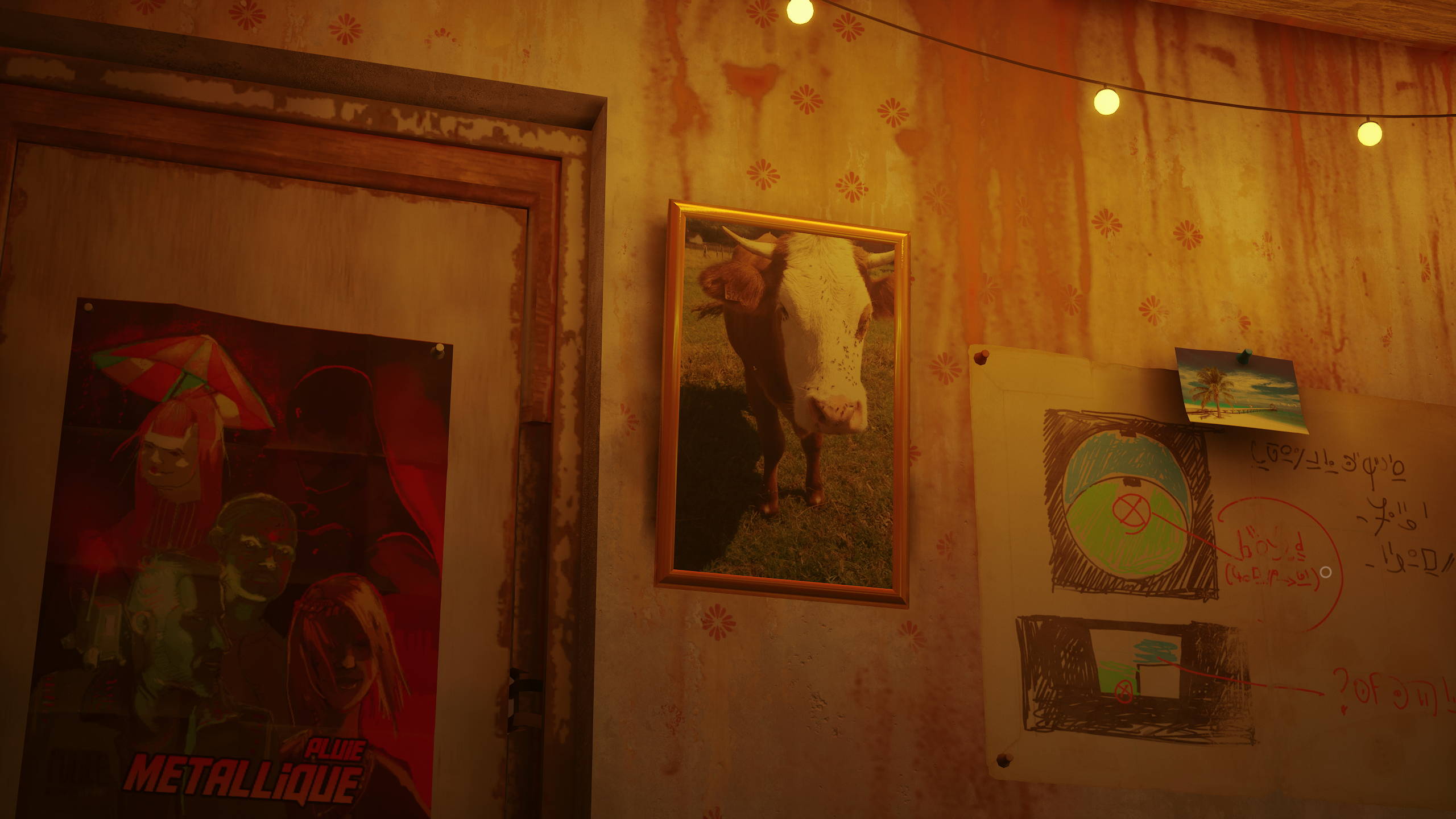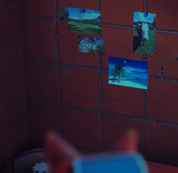 В игре где только возможно висят картины с тропическими местами, видимо люди хранили их для надежды, что когда-то вернутся такие благоприятные для Земли времена. Можно было бы и разные картины повесить, хотя скорей всего после катастрофы кто-то из людей сохранил две версии картин на съемном накопителе, и их массово распечатали и почти каждому раздали.