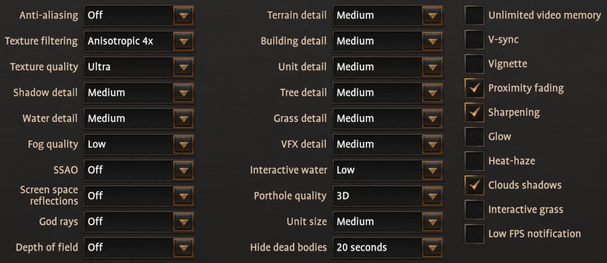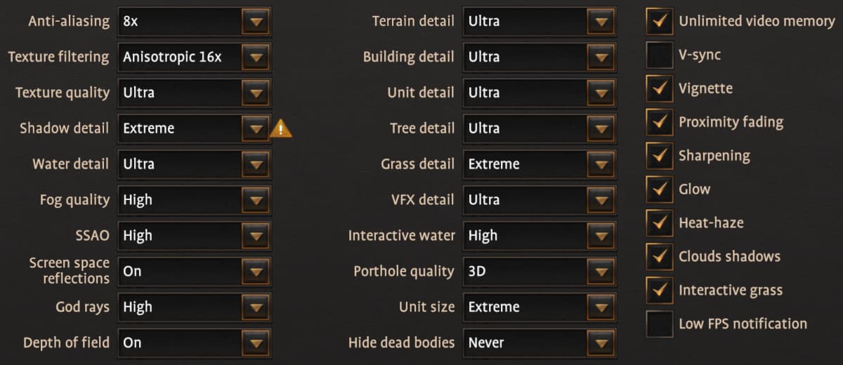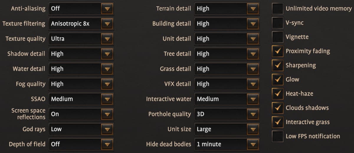А вот профиль Ultra в игре довольно спорный уже потому, что он добавляет использование ресурсоемкого метода сглаживания MSAA, который весьма негативно сказывается на производительности, не давая такого же значительного эффекта в картинке. Также удивительно, что переход с настроек High до Ultra не изменяет размера отрядов, при обоих профилях выставляется Large, хотя есть еще Ultra и Extreme. Но эти значения в принципе рекомендуются лишь для самых мощных систем, и больше всего это касается CPU.