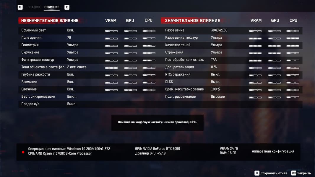 На системе с топовой GeForce RTX 3090, имеющей 24 ГБ собственной памяти, при ультра-настройках и в 4K-разрешении даже без текстурного пака используется около 7 ГБ видеопамяти. И даже в Full HD при максимальных настройках занимается более 6 ГБ памяти, так что это и можно назвать минимально подходящим объемом, а 8 ГБ — еще более реалистичным требованием для этой игры. С улучшенными текстурами минимальным объемом VRAM будет 8 ГБ, а при включении трассировки желательно иметь от 10 ГБ локальной видеопамяти. Так что 8 ГБ на недавно анонсированных GeForce RTX 3070 и RTX 3060 Ti иногда уже может немного не хватать. Впрочем, там уже и сами GPU не потянут.