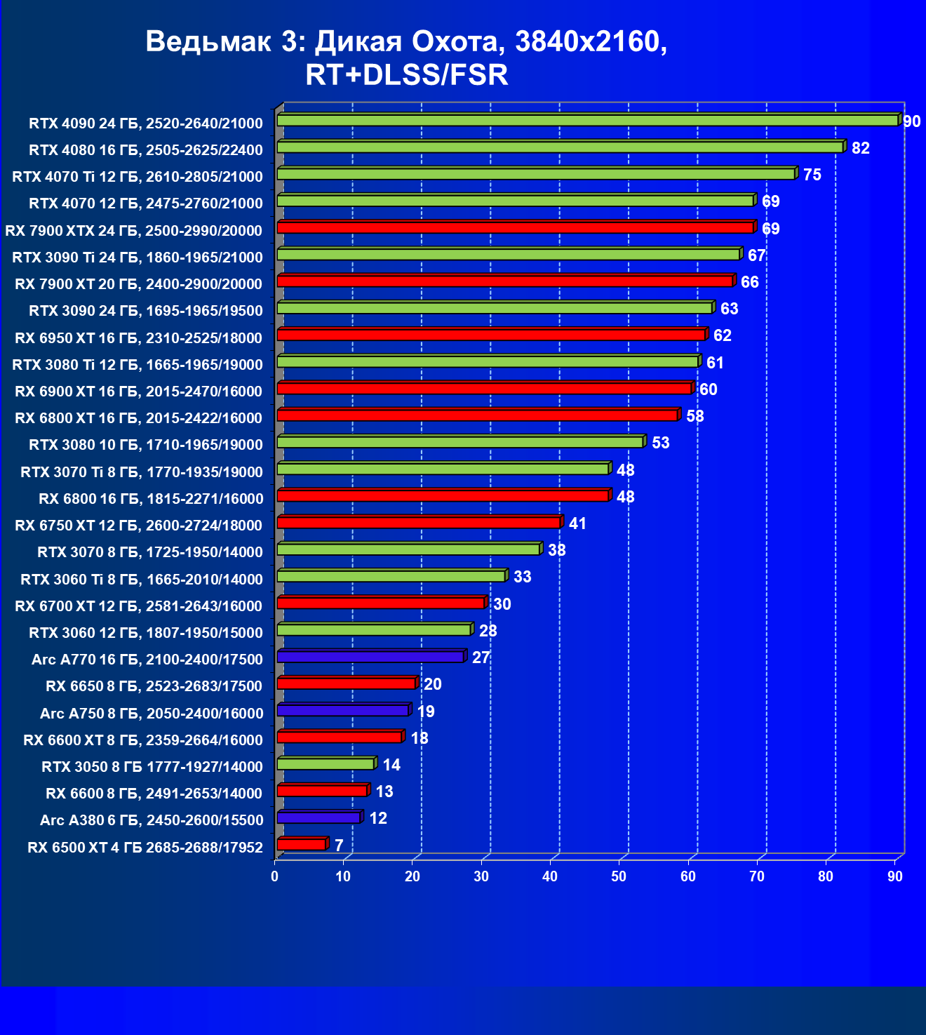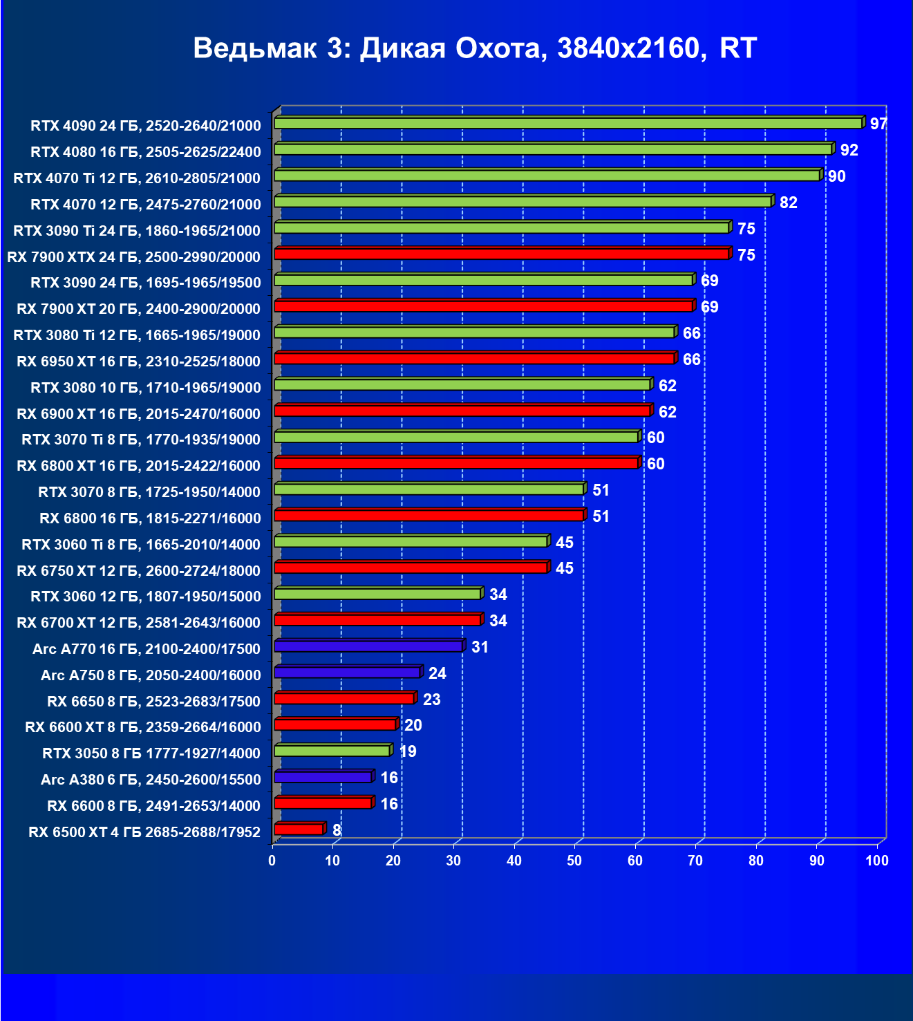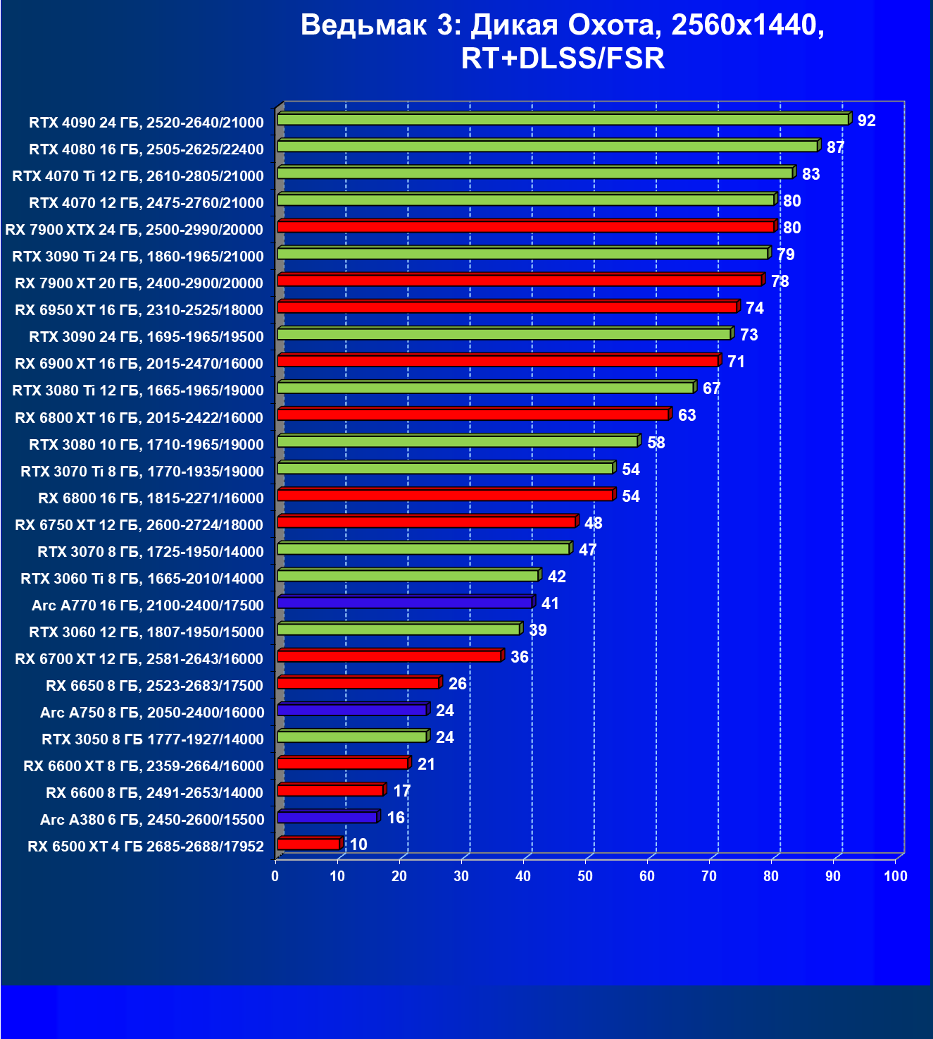 В разрешении Full HD при включении трассировки лучей без DLSS и FSR нужно вооружиться GeForce RTX 3060 Ti, Radeon RX 6750 XT или Intel Arc 770. В разрешении 2.5K достаточную производительность обеспечат GeForce RTX 3070 и Radeon RX 6800. В разрешении 4K для комфорта потребуется GeForce RTX 3070 Ti, но лучше GeForce RTX 3080 и выше, а также Radeon RX 6800 XT и выше.
