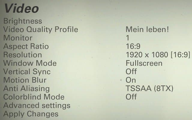 В игре есть основное меню, настройки в котором влияют на графику — Video. Тут есть выбор предустановленного профиля качества графики, разрешения рендеринга и соотношения сторон экрана, полноэкранного или оконного режима вывода, настройка яркости экрана, возможность включить или выключить вертикальную синхронизацию, настройка размытия в движении (почему-то ее поместили сюда), а также выбор метода полноэкранного сглаживания. В дополнение к настройке разрешения экрана, в Wolfenstein II есть масштабирование разрешения рендеринга Resolution Scale, которое позволяет снизить разрешение рендеринга по сравнению с разрешением вывода. А вот повысить разрешение рендеринга, получив дополнительный суперсэмплинг, в игре нельзя.