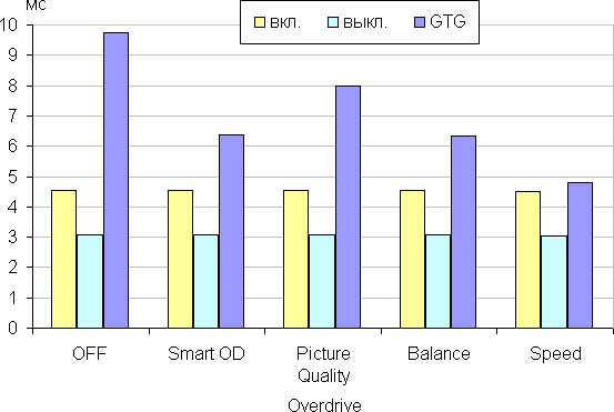 Время отклика зависит от значения настройки Overdrive, которая управляет разгоном матрицы. Ступеней регулировки пять. График ниже показывает, как меняется время включения и выключения при переходе черный-белый-черный (столбики «вкл.» и «выкл.»), а также среднее суммарное время для переходов между полутонами (столбики GTG) в случае режима с частотой обновления 270 Гц: