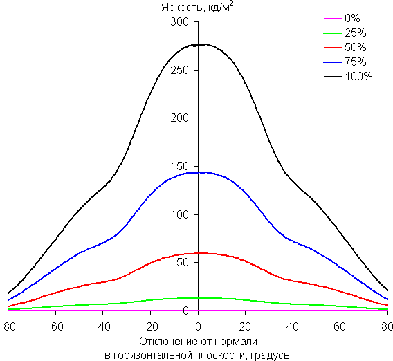 В качестве реперной точки можно выбрать отклонение в 45°, что может быть актуальным в случае, например, если изображение на экране рассматривают два человека одновременно. Критерием сохранения правильности цветов можно считать значение ΔE меньше 3. Стабильность цветов хорошая, это является одним из главных достоинств матрицы типа IPS.