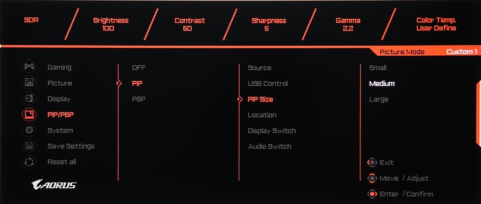 Присутствуют функции картинка-в-картинке (PIP) и картинка-рядом-с-картинкой (PBP). В режиме PIP выбирается положение дополнительного окна в одном из четырех углов, а также его размер из трех возможных. Изображение в дополнительном окне выводится сохранением исходных пропорций, а если соотношение сторон исходного изображения меньше 16:9, то по бокам выводятся черные полосы. Вывод пиксель в пиксель для дополнительного окна мы не получили.