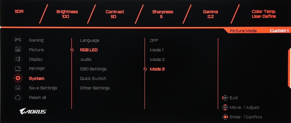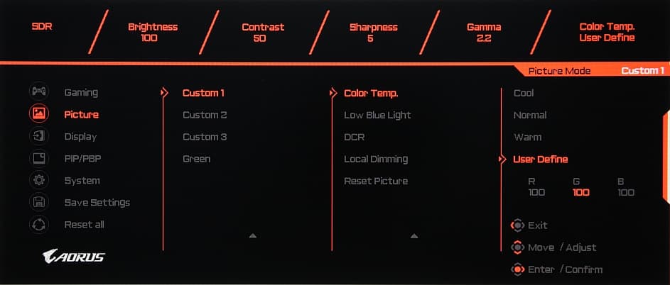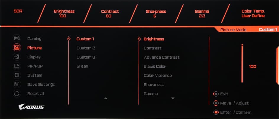 Навигация по меню очень удобная, так как все делается только джойстиком, не нужно переносить палец на кнопки, и количество необходимых действий разумно сокращено, к тому же списки зациклены. При настройке изображения меню остается на экране — это несколько мешает оценке вносимых изменений. При необходимости можно установить уровень прозрачности фона меню, выбрать тайм-аут автоматического выхода из меню и включить блокировку меню, что предотвращает случайное изменение настроек. Есть русская версия экранного меню. Качество перевода на русский язык среднее, есть ошибки и неточности, поэтому в тексте мы используем английские названия настроек. Кириллический шрифт мелкий с тонкими линиями, поэтому надписи на русском читаются с некоторым трудом. Напечатанной документации в комплекте поставки — самый минимум. Полные руководства пользователя в виде PDF-файлов (есть версия на русском языке) можно найти на сайте Gigabyte.