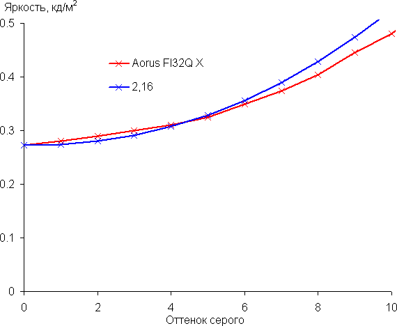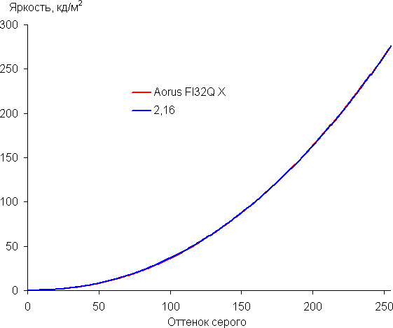 Аппроксимация полученной гамма-кривой дала показатель 2,16, что близко к стандартному значению 2,2, при этом реальная гамма-кривая мало отклоняется от аппроксимирующей степенной функции: