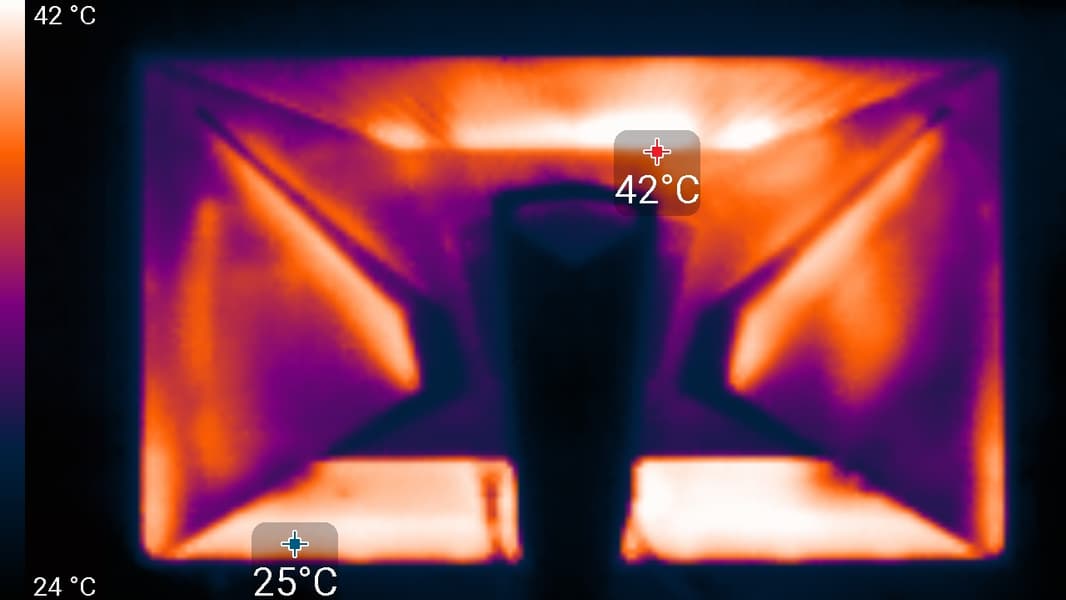 Нагрев монитора можно оценить по приведенному снимку с ИК-камеры, полученному после долговременной работы монитора на максимальной яркости (режим HDR) в помещении с температурой примерно 24 °C: