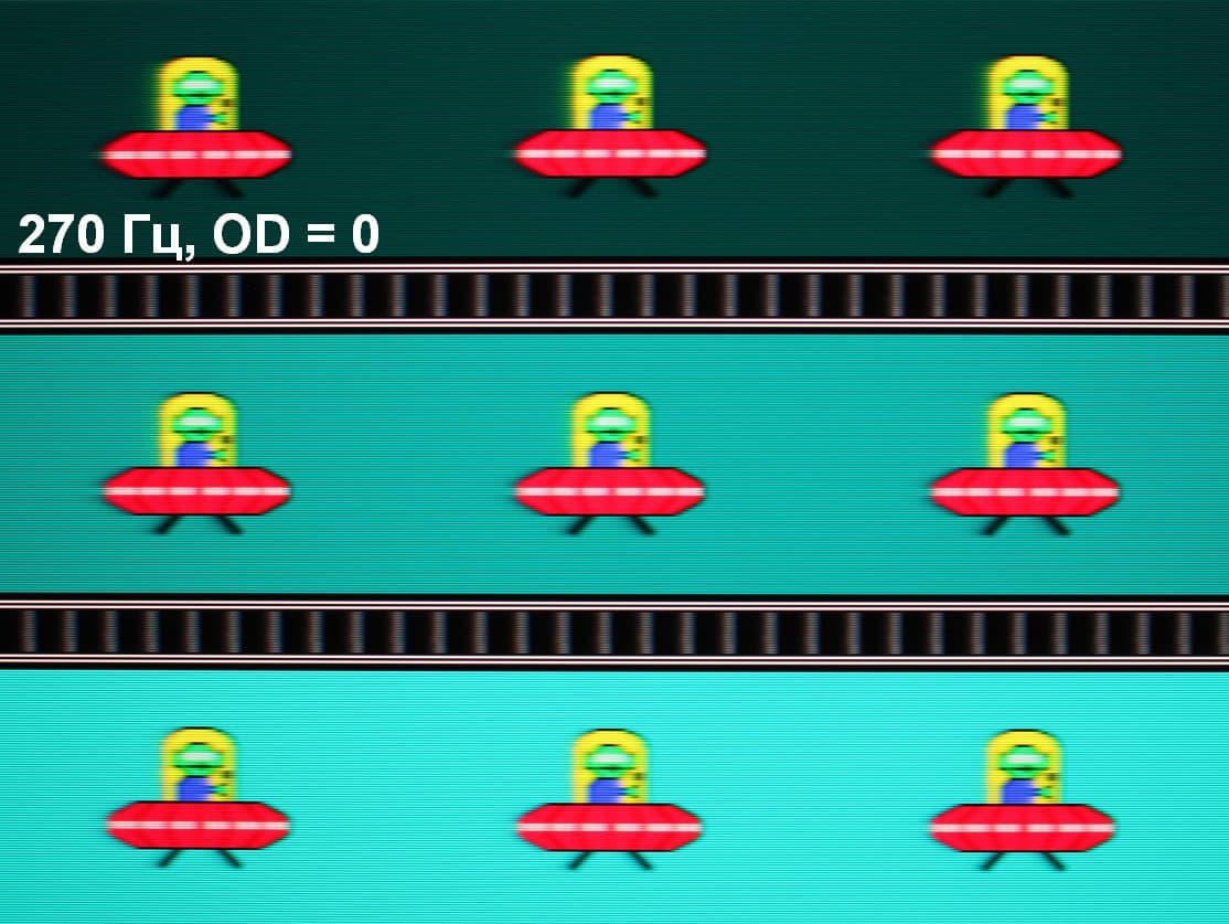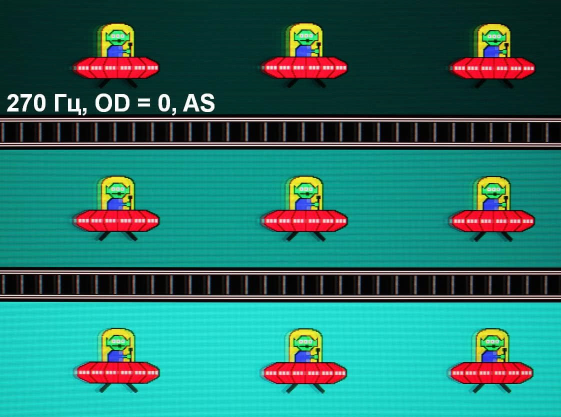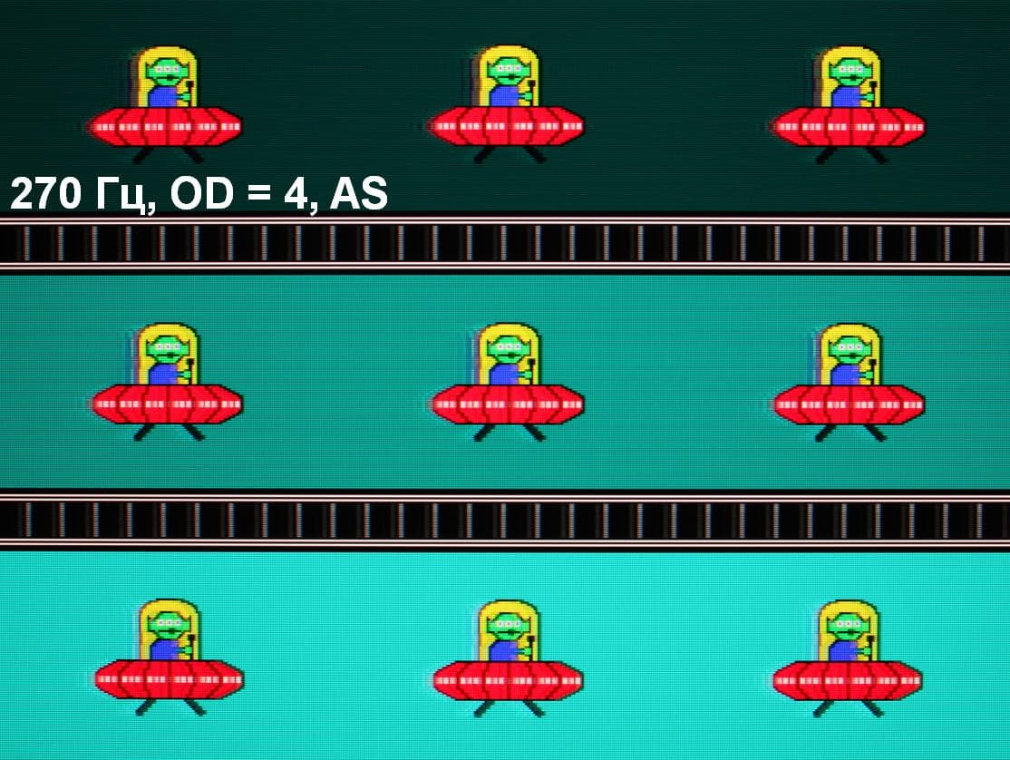 Для наглядного представления о том, что на практике означает такая скорость матрицы, какие могут быть артефакты от разгона и повышает ли четкость в движении, описанная выше настройка Aim Stabilizer Sync, приведем серию снимков, полученных с помощью движущейся камеры. Такие снимки показывают, что видит человек, если он следит глазами за двигающимся на экране объектом. Описание теста приведено тут, страница с самим тестом тут. Использовались рекомендованные установки (скорость движения 960, 1008, 990, 1000 и 1080 пиксель/с для частот обновления 60 (и 120), 144, 165, 200 и 270 Гц), выдержка 1/15 с, на фотографиях указаны значения частоты обновления, а также ступень разгона (OD) и включен ли режим Aim Stabilizer Sync (AS).