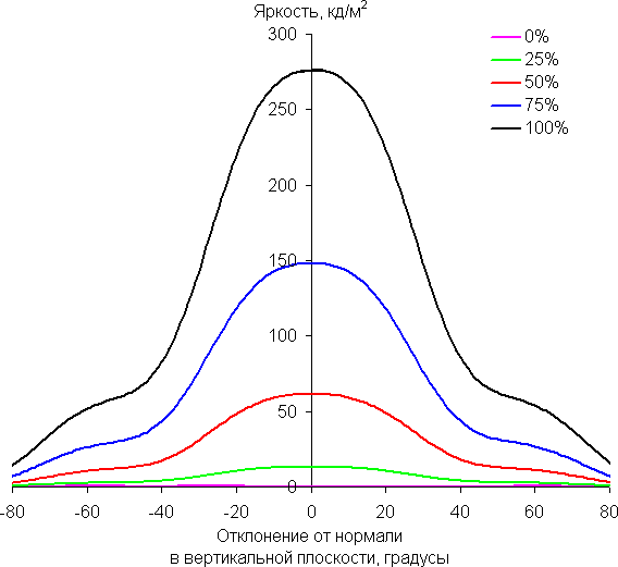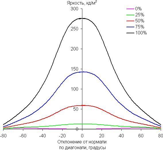 Чтобы выяснить, как меняется яркость экрана при отклонении от перпендикуляра к экрану, мы провели серию измерений яркости черного, белого и оттенков серого в центре экрана в широком диапазоне углов, отклоняя ось датчика в вертикальном, горизонтальном и диагональном (из угла в угол) направлениях.