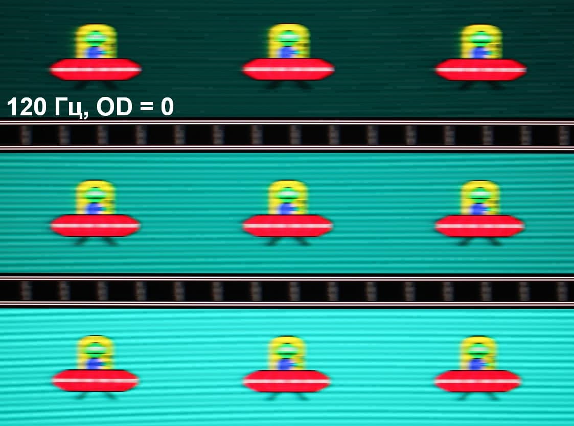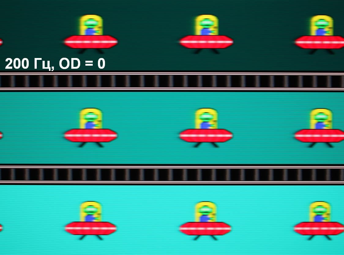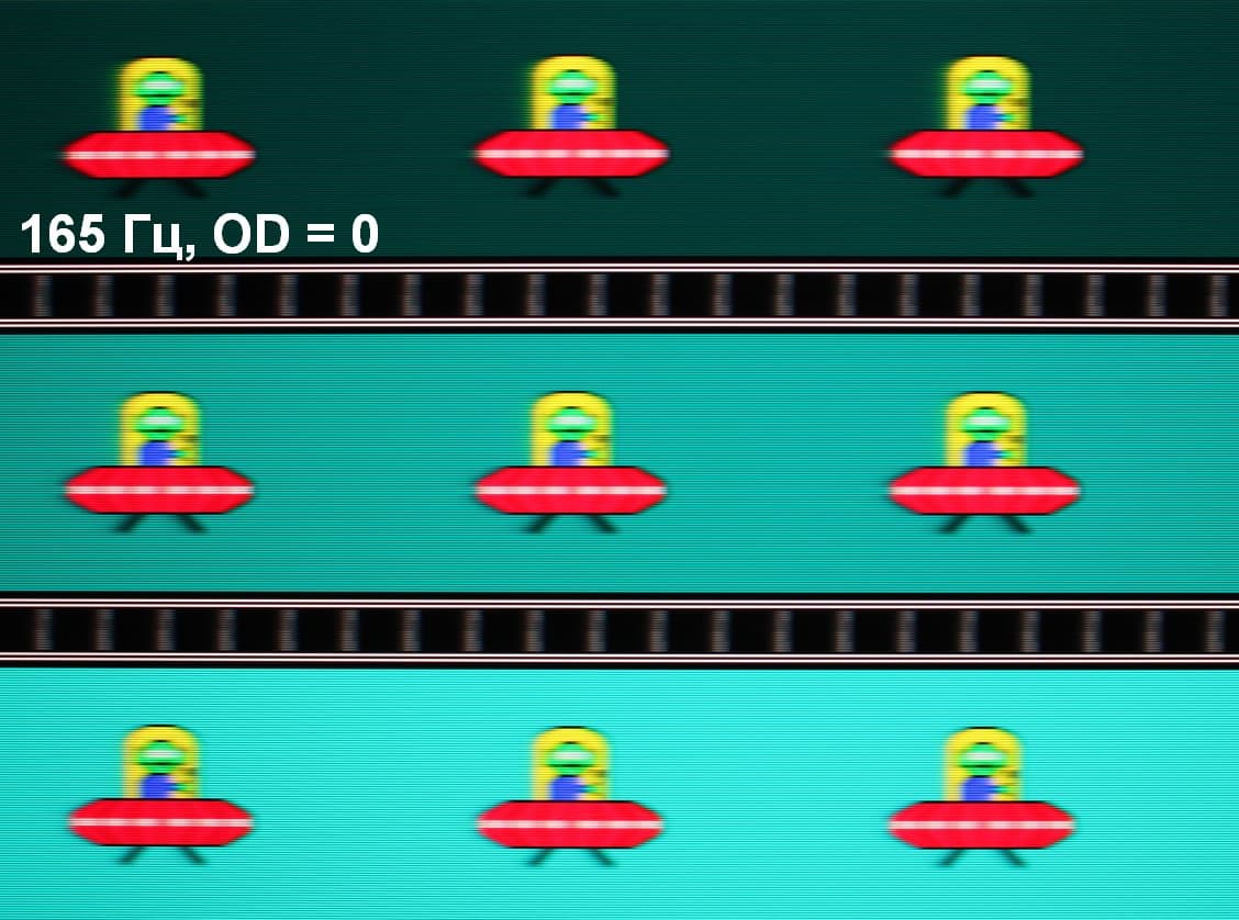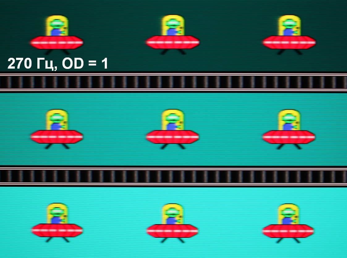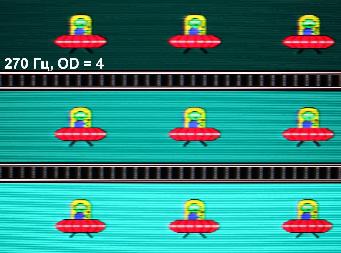 Видно, что при прочих равных условиях четкость изображения повышается по мере роста частоты обновления и степени разгона, но на максимальном разгоне артефакты уже заметные. Включение Aim Stabilizer увеличивает четкость, но объекты в движении троятся, что снижает положительный эффект. Оптимальным с нашей точки зрения является выбор предпоследней ступени разгона без включения Aim Stabilizer.