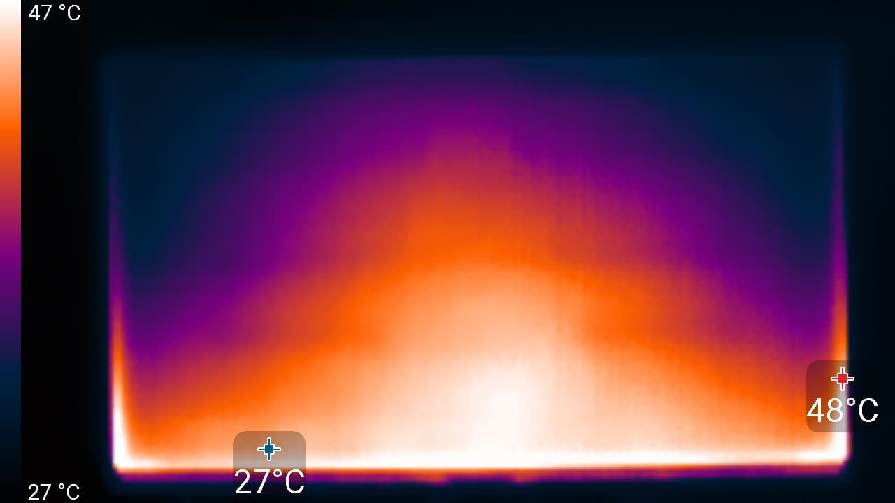 Видимо, внизу находится светодиодная линейка подсветки экрана. Нагрев сзади умеренный.