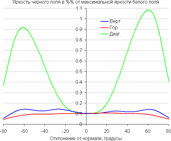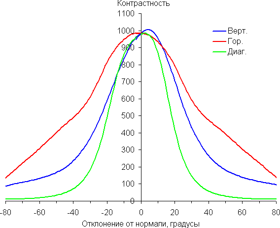Отметим примерно одинаковый характер уменьшения яркости при отклонении от перпендикуляра к экрану во всех трех направлениях, при этом в диапазоне измеряемых углов графики не пересекаются. Яркость снижается сильно уже при небольшом отклонении от перпендикуляра к экрану, поэтому по скорости снижения яркости углы обзора неширокие. При отклонении в диагональном направлении яркость черного поля начинает резко возрастать уже при 20°-30° отклонения от перпендикуляра к экрану. Если сидеть не очень далеко от экрана, то черное поле по углам будет заметно светлее, чем в центре. Контрастность в диапазоне углов ±82° приближается к отметке 10:1 только при отклонении по диагонали, но все равно остается существенно выше этого значения.