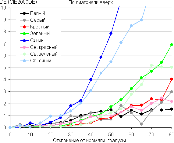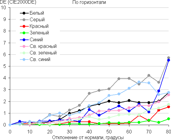 Для количественной характеристики изменения цветопередачи мы провели колориметрические измерения для белого, серого (127, 127, 127), красного, зеленого и синего, а также светло-красного, светло-зеленого и светло-синего полей во весь экран с использованием установки, подобной той, что применялась в предыдущем тесте. Измерения проводились в диапазоне углов от 0° (датчик направлен перпендикулярно к экрану) до 80° с шагом в 5°. Полученные значения интенсивностей были пересчитаны в ΔE относительно замера каждого поля при перпендикулярном положении датчика относительно экрана. Результаты представлены ниже: