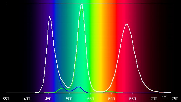 Ниже приведен спектр для белого поля (белая линия), наложенный на спектры красного, зеленого и синего полей (линии соответствующих цветов) в случае исходного цветового охвата: