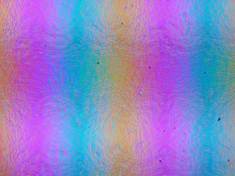 Зерно этих дефектов в несколько раз меньше размеров субпикселей (масштаб этих двух фотографий одинаковый), поэтому фокусировка на микродефектах и «перескок» фокуса по субпикселям при изменении угла зрения выражены слабо, из-за этого нет и «кристаллического» эффекта.