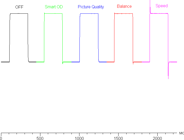 Ниже приведены графики полутонового перехода между оттенками 70% и 90% и обратно при различных значениях настройки Overdrive (по вертикали — яркость, по горизонтали — время, для наглядности графики выстроены последовательно):