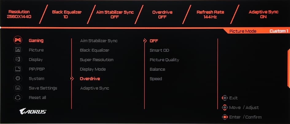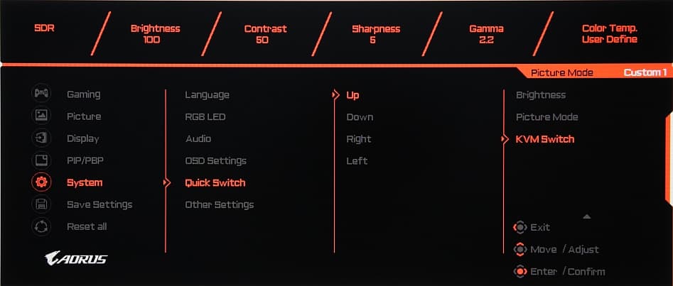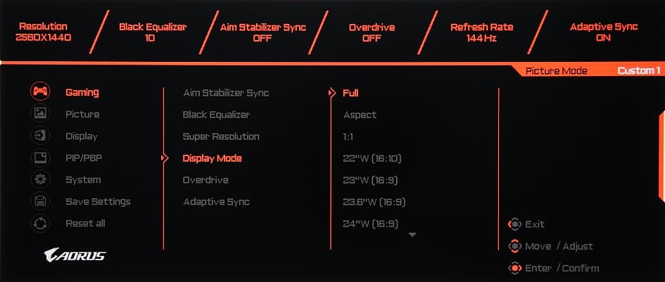Если на экране оно, то нажатие на джойстик — выход из меню, отклонение вниз — выключение монитора (его можно выключить и без меню длительным нажатием на джойстик), вверх — вход в основное меню установок, вправо — меню с настройками игровых функций, влево — настройка информационной панели.