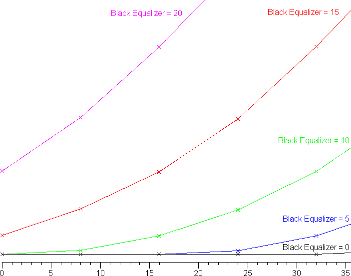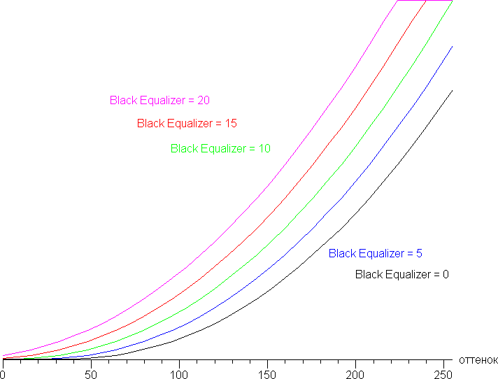 Дополнительной настройкой Black Equalizer (значения от 0 до 20, по умолчанию 10) можно скорректировать гамма-кривую, улучшая различимость деталей в тенях. Это может быть полезно в играх с темными сценами. Ниже приведены гамма-кривые при нескольких значениях Black Equalizer: