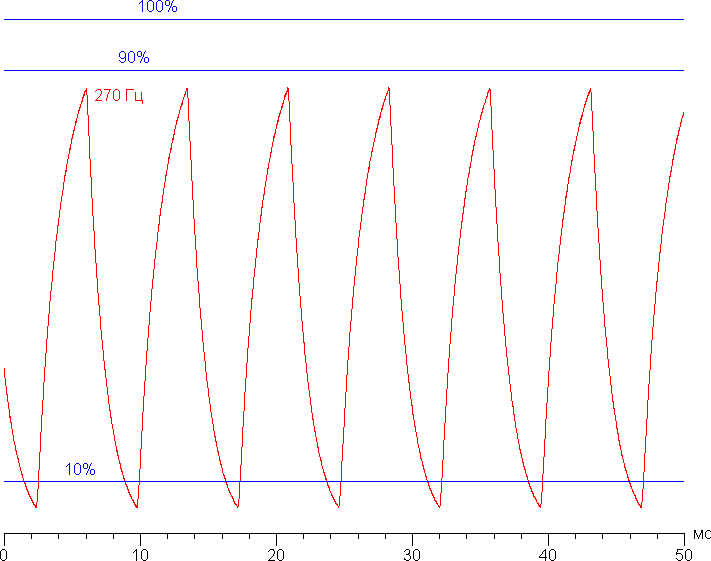 Приведем зависимость яркости от времени при чередовании белого и черного кадра при 270 Гц кадровой частоты. Яркость белого поля — это 100% на графике: