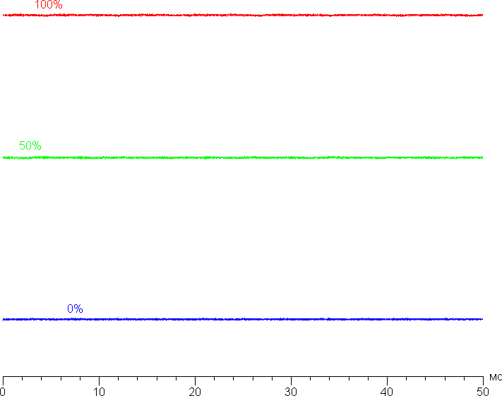 Яркость монитора меняется именно яркостью подсветки, то есть без ущерба для качества изображения (сохраняется контрастность и количество различимых градаций) яркость монитора можно менять в довольно широких пределах, что позволяет с комфортом играть, работать и смотреть фильмы как в освещенном, так и в темном помещении, хотя для последнего случая минимальная яркость кому-то может показаться высоковатой. На любом уровне яркости значимая модуляция подсветки отсутствует, что исключает видимое мерцание экрана. Для тех, кто привык распознавать знакомое сокращение, уточним: ШИМ отсутствует. В доказательство приведем графики зависимости яркости (вертикальная ось) от времени (горизонтальная ось) при различных значениях настройки яркости: