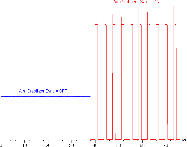 Есть режим со вставкой черного кадра с названием Aim Stabilizer Sync. Зависимости яркости (вертикальная ось) от времени (горизонтальная ось), когда яркость установлена на максимум (левая половина), и когда включена функция Aim Stabilizer Sync (правая половина):