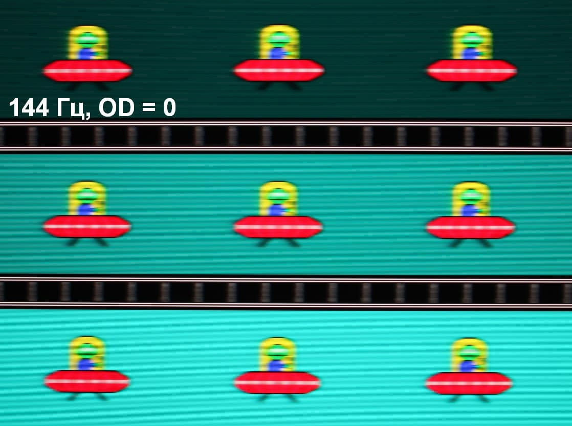 Попробуем представить, что было бы в случае матрицы с мгновенным переключением пикселей. Для нее при 60 Гц объект со скоростью движения 960 пиксель/с размывается на 16 пикселей, при 120 Гц — на 8 пикселя, при 144 Гц (1008 пиксель/с) — на 7, при 165 Гц (990 пиксель/с) — на 6, при 200 Гц (1000 пиксель/с) — на 5, при 270 Гц (1080 пиксель/с) — на 4 пикселя. Размывается, так как фокус зрения движется с указанной скоростью, а объект неподвижно выводится на 1/60, 1/120, 1/144, 1/165, 1/200 или 1/270 секунды. Для иллюстрации этого сымитируем размытие на соответствующее количество пикселей: