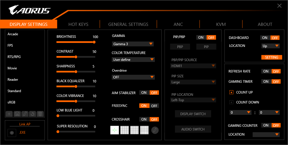 Из дополнительных возможностей в наборе Game Assist (Игровой ассистент) присутствуют несколько «геймерских» функции: таймер, пользовательский счетчик, вывод частоты кадров, перекрестия прицела в центре экрана и меток для выравнивания установленных встык мониторов.