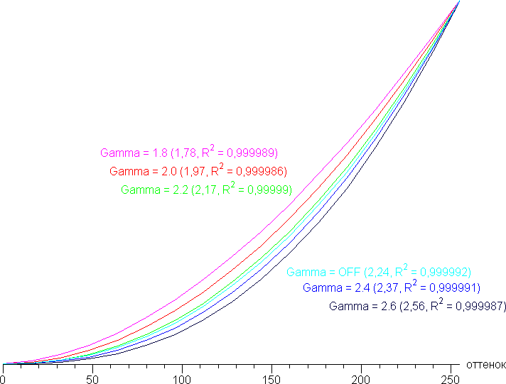 Реальная гамма-кривая зависит от выбранного значения списке Gamma (Гамма). Значения показателей аппроксимирующей функции приведены в скобках в подписях, там же — коэффициент детерминации R2: