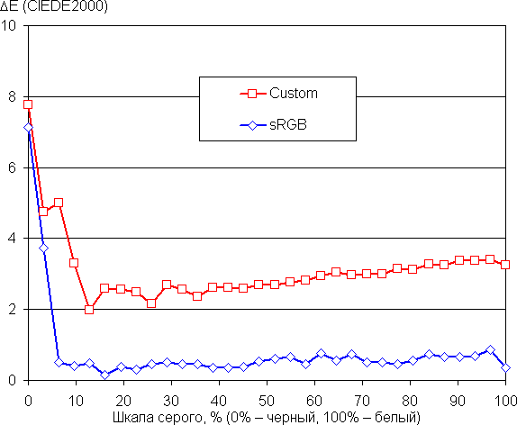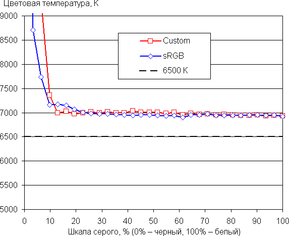 Цветовой баланс просто при выборе профиля User Define для настройки Color Temp., который обеспечивает максимальную яркость и контрастность с сохранением приемлемого качества изображения, хороший, так как цветовая температура близка к стандартным 6500 К, и отклонение от спектра абсолютно черного тела (параметр ΔE) невелико. При выборе профиля sRGB цветовой баланс еще лучше, так как ΔE ниже 2. Графики ниже показывают цветовую температуру на различных участках шкалы серого и ΔE для профиля Custom (при Color Temp. = User Define (100/100/100)) и для профиля sRGB.