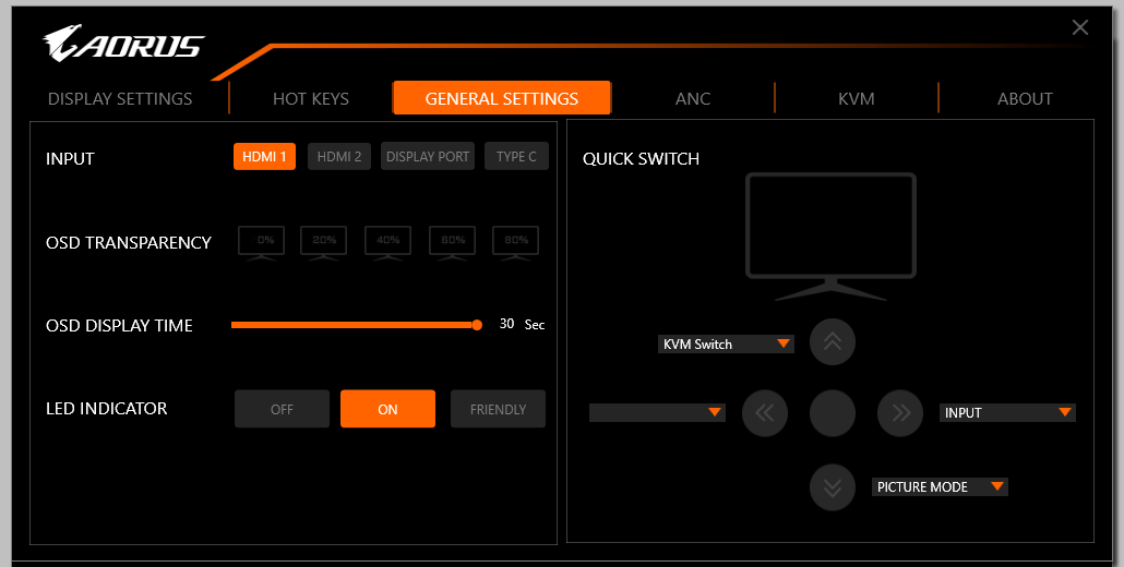 Индикатор питания при работе неярко (почти незаметно) светится белым, в режиме ожидания — оранжевым и не горит, если монитор условно выключен. Включается монитор нажатием на джойстик. Когда монитор включен и на экране нет меню, то при отклонении джойстика вверх, вниз, вправо или влево на экран выводится ползунок или список той настройки, которая назначена пользователем на данное отклонение джойстика, или сразу выполняется выбранное действие: