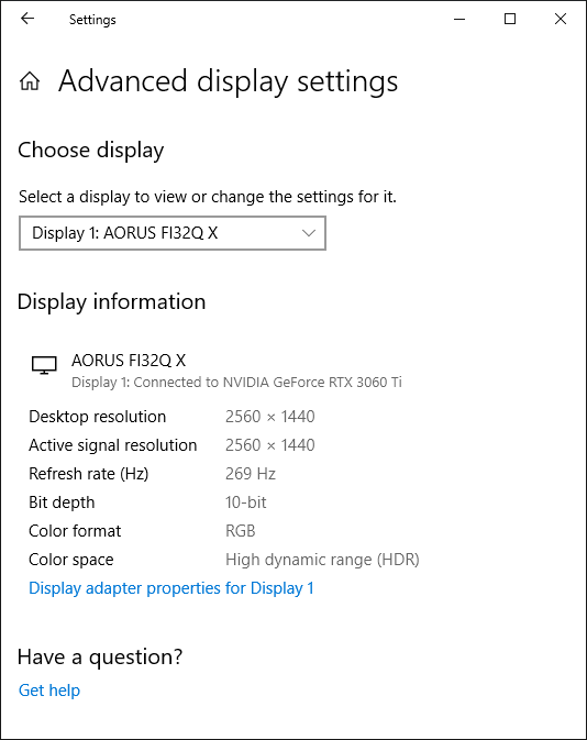 При подключении к компьютеру по DisplayPort поддерживалось разрешение до 2560×1440 при 270 Гц кадровой частоты на вход, и вывод изображения на экран также осуществлялся с этой частотой, в случае HDMI — только до 2560×1440 при 144 Гц (частота 240 Гц в списке присутствовала, но на нее монитор и видеокарта не переключались). При таких сочетаниях разрешения и частот обновления поддерживается HDR. По DisplayPort при 270 Гц — 10 бит на цвет, по HDMI при 144 Гц — 12 бит на цвет.