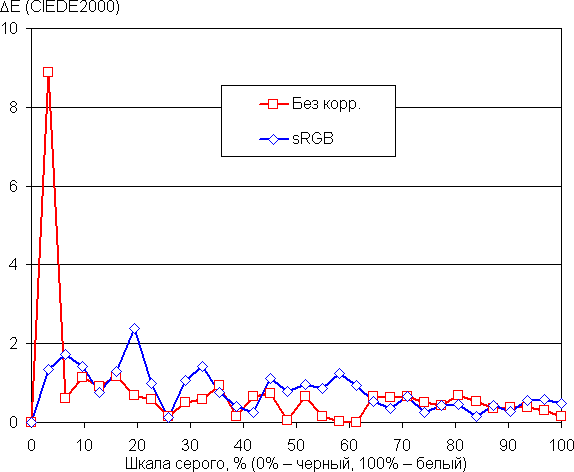 Графики ниже показывают цветовую температуру на различных участках шкалы серого и отклонение от спектра абсолютно черного тела (параметр ΔE) в случае настроек по умолчанию (подписано — Без корр.) и при выборе профиля sRGB (sRGB) также без дополнительной коррекции (которая, впрочем, и так невозможна):