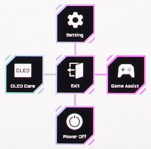 Если на экране оно, то нажатие на джойстик — выход из меню, отклонение вниз — выключение монитора (его можно выключить и без меню длительным нажатием на джойстик), вверх — вход в основное меню установок, вправо — меню с настройками игровых функций, влево — функции OLED Care.