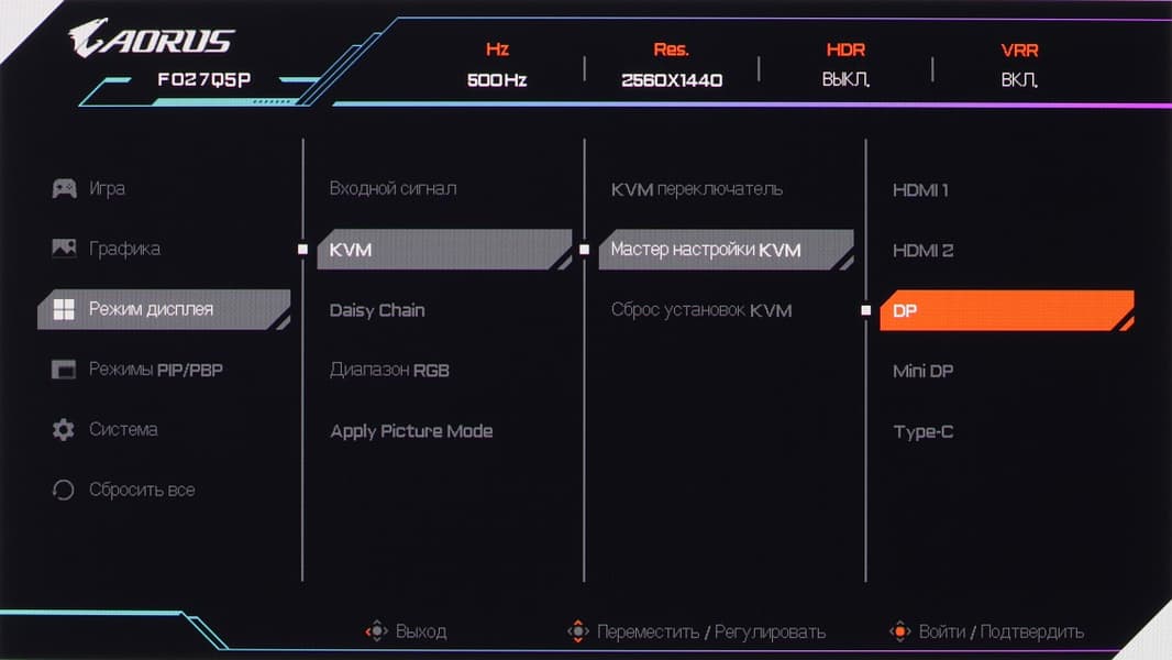 При подключении к компьютеру по DisplayPort, или по HDMI, или по USB-C поддерживается разрешение до 2560×1440 при 500 Гц кадровой частоты без потери цветовой четкости в режиме до 10 бит (по HDMI — 12 бит) включительно на цвет на вход. Отметим, что при подключении по DisplayPort и по HDMI поддерживается сигнал 1080@120p на вход, что обеспечивает лучшую совместимость с приставками (игровыми консолями).
