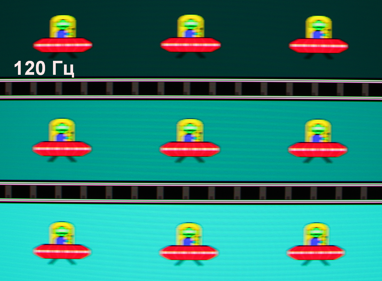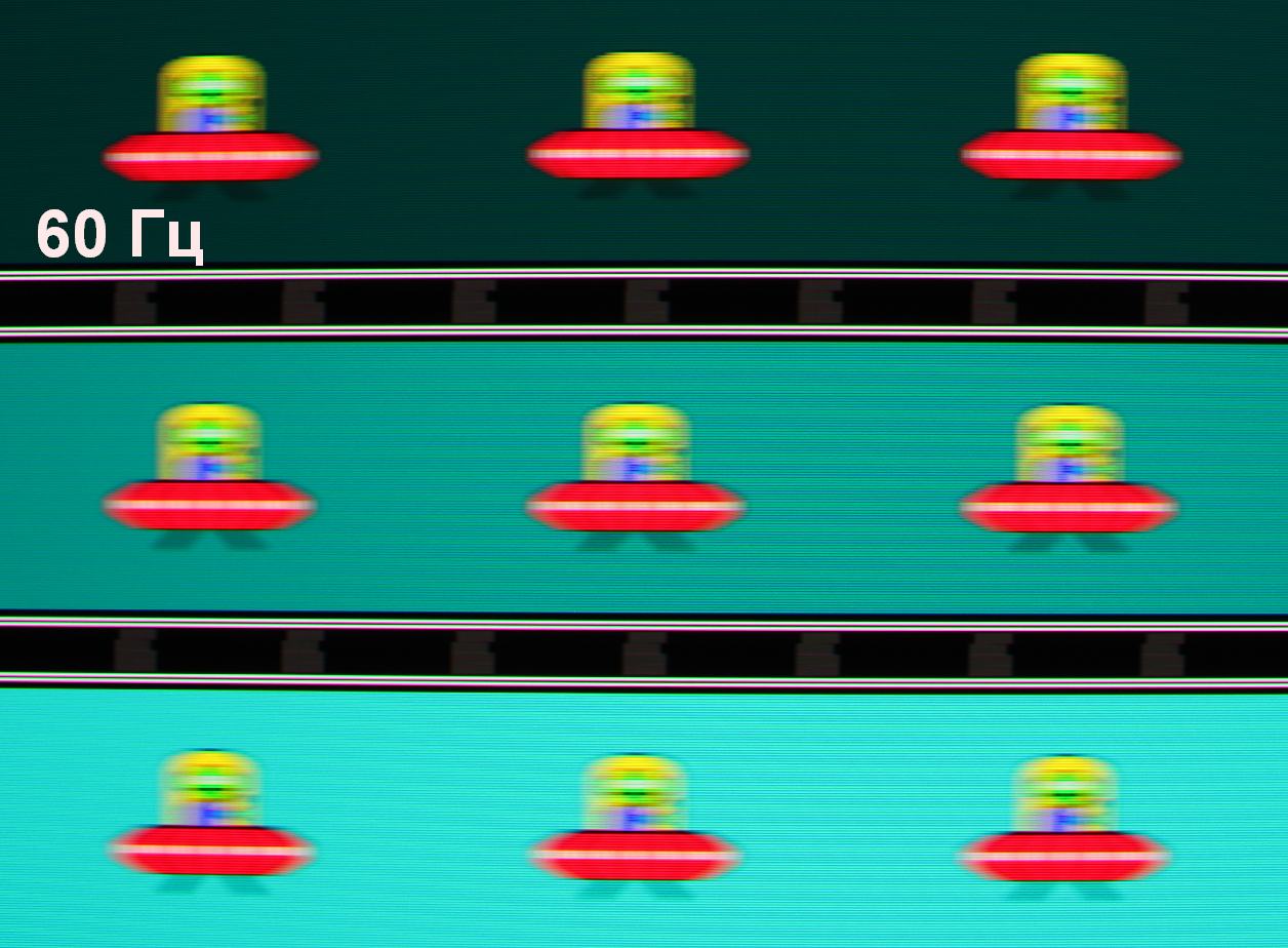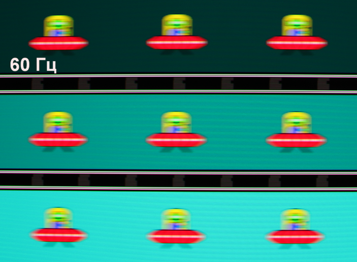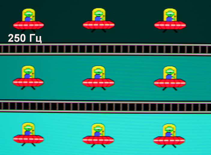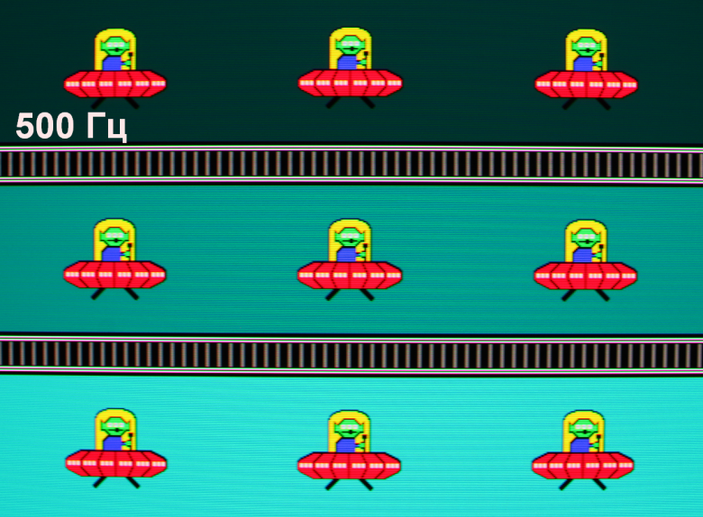 Для наглядного представления о том, что на практике означает такая скорость матрицы приведем серию снимков, полученных с помощью движущейся камеры. Такие снимки показывают, что видит человек, если он следит глазами за двигающимся на экране объектом. Описание теста приведено тут, страница с самим тестом тут. Использовались рекомендованные установки (скорость движения 960 пиксель/с для частот 60 Гц и 120 Гц и 1000 пиксель/с для 250 Гц и 500 Гц), выдержка 1/15 с. На фотографиях указаны значения частоты обновления: