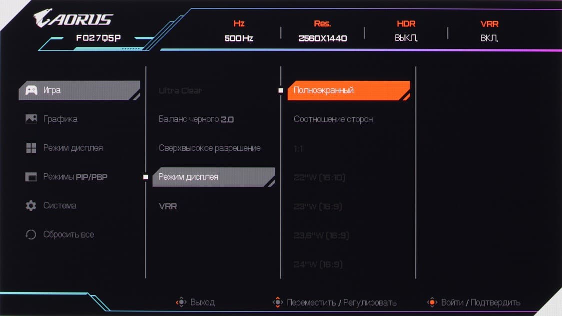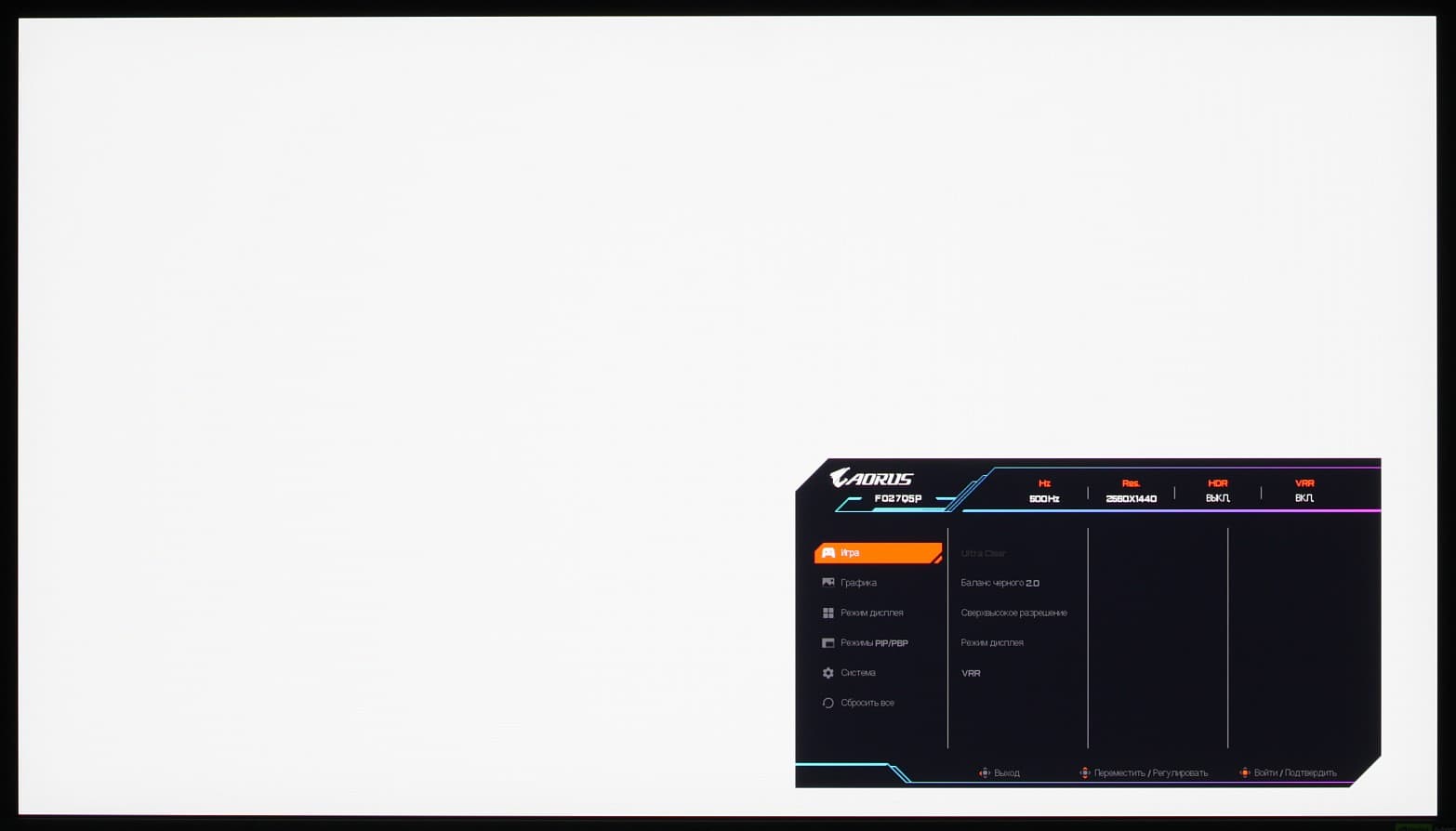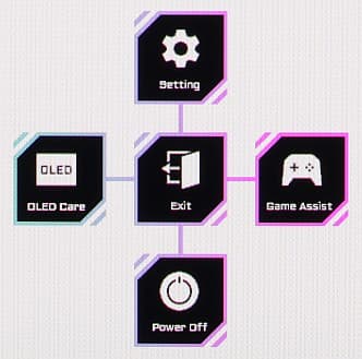 Если на экране оно, то нажатие на джойстик — выход из меню, отклонение вниз — выключение монитора (его можно выключить и без меню длительным нажатием на джойстик), вверх — вход в основное меню установок, вправо — меню с настройками игровых функций, влево — функции OLED Care. Далее при навигации по меню в низу выводятся подсказки по текущим функциям джойстика. Меню достаточно крупное, масштаб позволяет оценить снимок ниже, где видна вся область отображения монитора:
