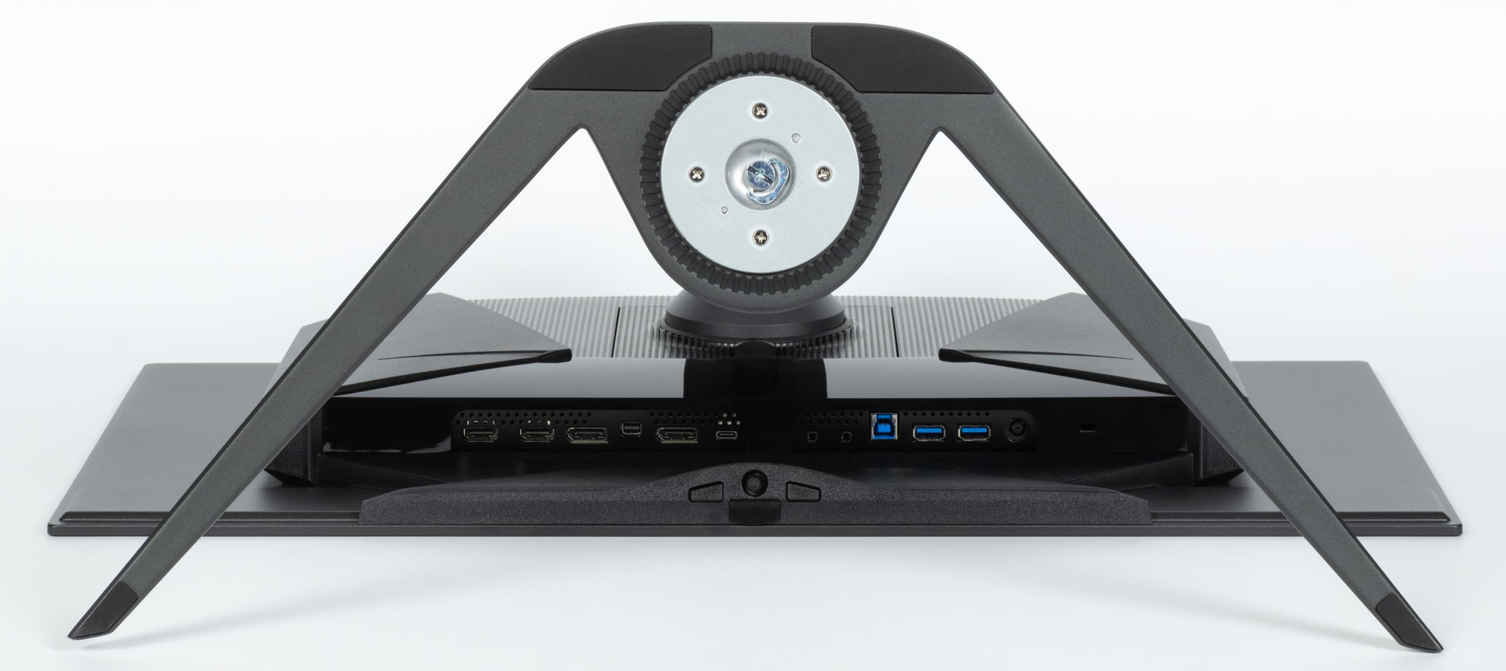 На штатной подставке монитор стоит устойчиво. Несущие элементы подставки изготовлены из толстой штампованной стали и алюминиевого сплава. Конструкция подставки достаточно жесткая. Накладки из резины снизу на основании подставки защищают поверхность стола от царапин и предотвращают скольжение монитора на гладких поверхностях. Между широко расставленными опорами подставки близко к монитору можно поместить даже полноразмерную клавиатуру.