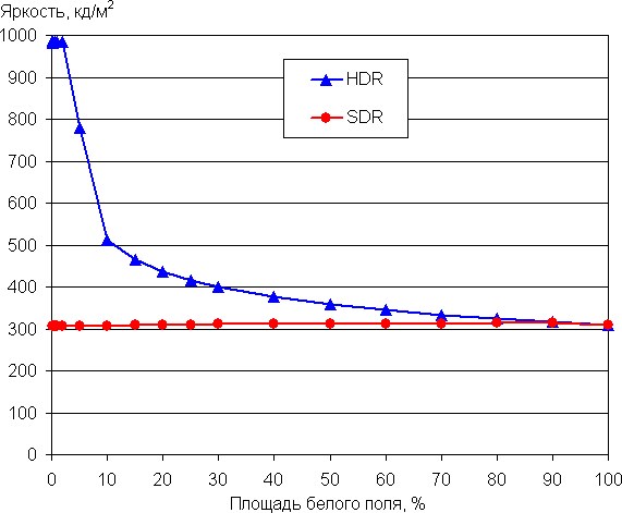 С изменением площади белого максимальная яркость также может меняться, при этом характер зависимости яркости от площади белого участка зависит как минимум от текущего режима — SDR или HDR. Например, в случае сигнала SDR яркость от 0,1% до 100% площади белого сохраняется на уровне порядка 300 кд/м². В случае сигнала HDR пиковая яркость достигает почти 1000 кд/м² на площади до 2% белого, после чего начинает плавно снижаться до примерно тех же 300 кд/м² (целевая яркость контента 4000 кд/м²):