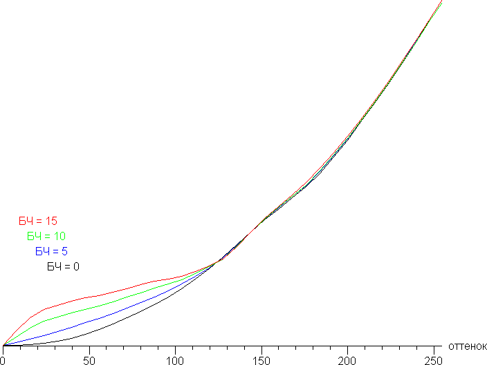 Дополнительной настройкой Баланс черного (значения от 0 до 15 с шагом 1, по умолчанию 0) можно скорректировать гамма-кривую, улучшая различимость деталей в тенях. Это может быть полезно в играх с темными сценами. Ниже приведены гамма-кривые при нескольких значениях БЧ (построенные по 32 точкам):