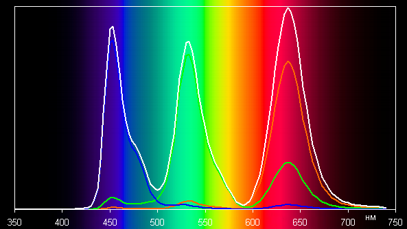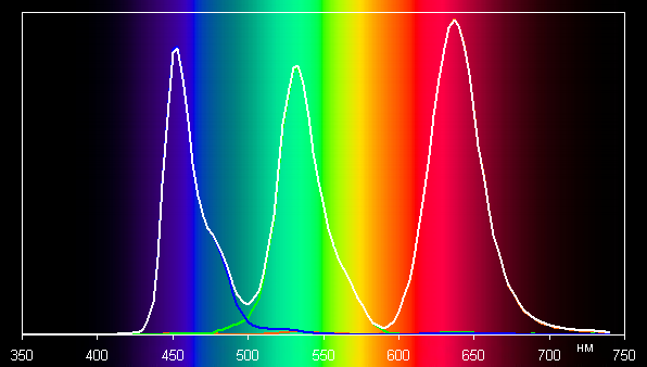 Ниже приведен спектр для белого поля (белая линия), наложенный на спектры красного, зеленого и синего полей (линии соответствующих цветов) в случае исходного цветового охвата: