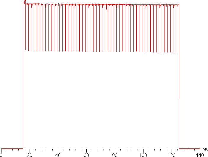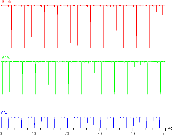 На любом уровне яркости видимое мерцание отсутствует, его не выявляет и тест на стробоскопический эффект. Регистрация зависимости яркости от времени при различных уровнях яркости выявила модуляцию яркости с очень высоким коэффициентом заполнения, что и объясняет отсутствие мерцания. В доказательство приведем графики зависимости яркости (вертикальная ось) от времени (горизонтальная ось) при различных значениях настройки Яркость в случае белого поля на 10% от площади экрана.