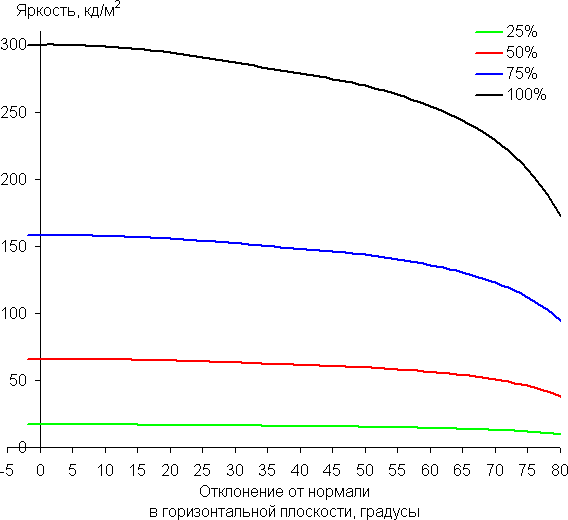 Снижение яркости на 50% от максимального значения достигается только при более чем 80 градусах отклонения. Для сравнения: в случае типичного ЖК-монитора на матрице VA яркость падает вдвое уже примерно при 35°.