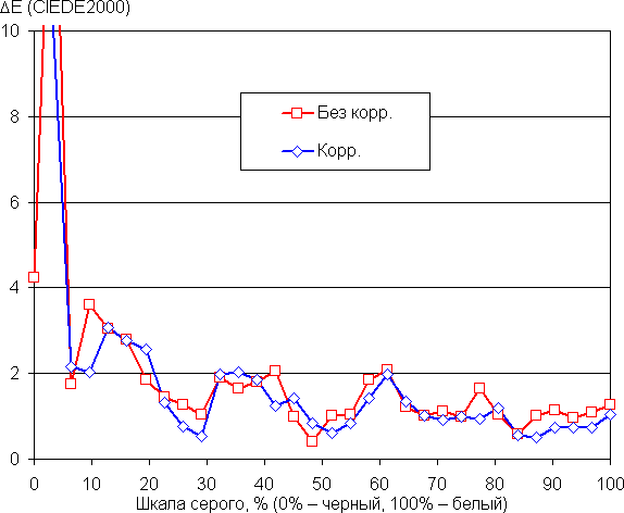 Самый близкий к черному диапазон можно не учитывать, так как в нем цветопередача не так важна, а погрешность измерения цветовых характеристик высокая. Цветовой баланс во всех двух случаях хороший, так как цветовая температура достаточно близка к стандартным 6500 К и отклонение от спектра абсолютно черного тела (ΔE) ниже 10 единиц, что для потребительского устройства считается приемлемым показателем. При этом оба параметра мало изменяются на различных участках шкалы серого, что улучшает визуальное восприятие цветового баланса. Видно, что простой корректировкой цветовой баланс удается слегка улучшить.