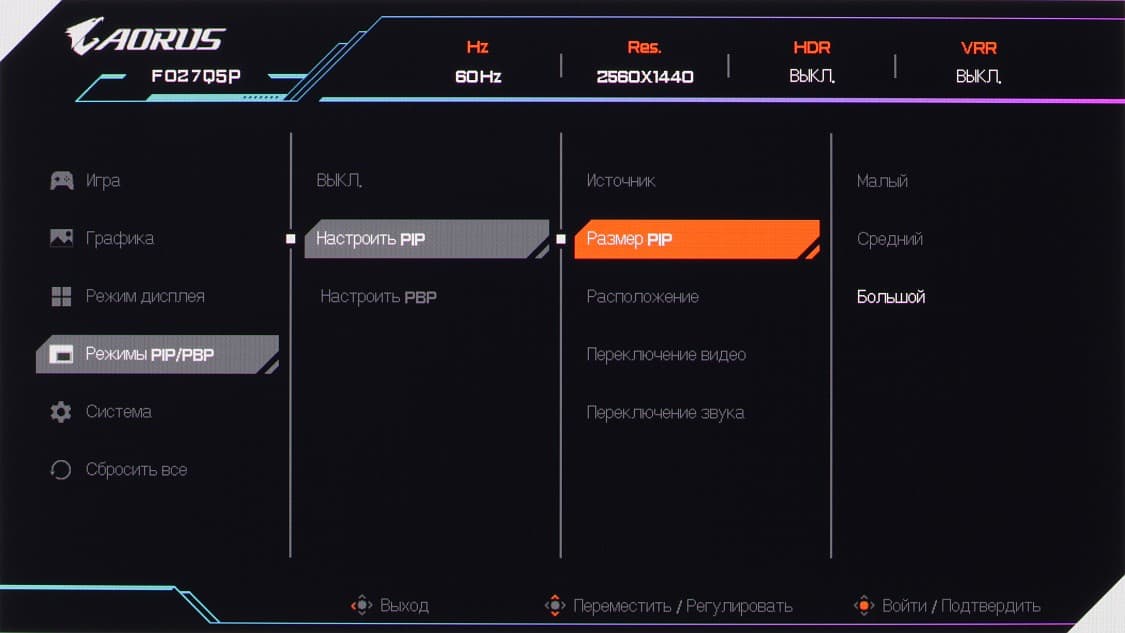 В режиме PIP выбирается положение дополнительного окна в одном из четырех углов, а также его размер из трех возможных (самый большой — это точно 1/4 экрана). В режиме PBP можно получить два изображения 1280×1440 с выводом точка в точку от независимых источников с заполнением всей области отображения.