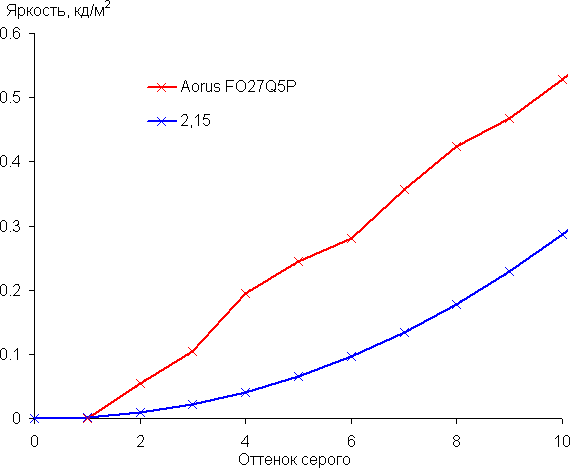 Рост скорости изменения яркости более-менее равномерный, и почти каждый следующий оттенок значимо ярче предыдущего. Только в самой темной области первый оттенок серого сливается с черным, что не принципиально. Зато другие оттенки в тенях хорошо различаются, что для игрового монитора важно: