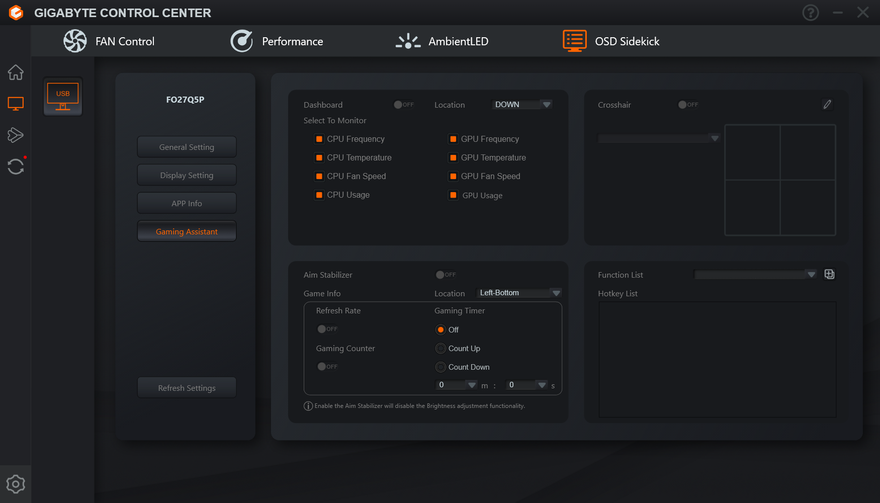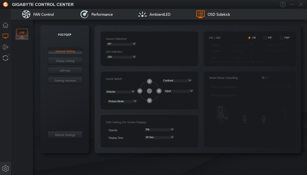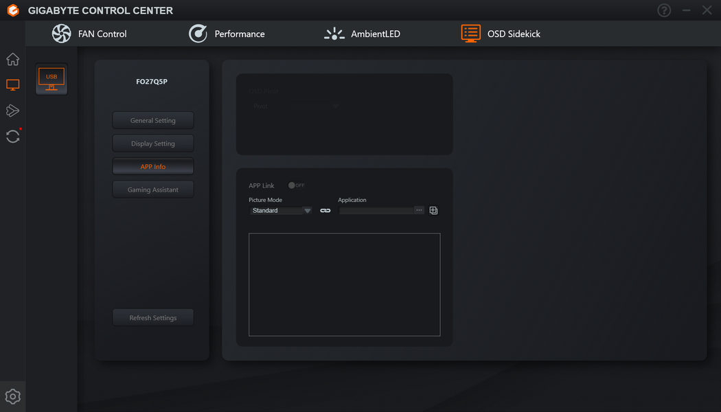 Монитором можно управлять с ПК с помощью фирменного ПО Gigabyte Control Center на вкладке Sidekick. Кроме настроек, доступных из меню монитора, в этом ПО можно привязывать профиль с настройками монитора к активному приложению. Только при запущенной Gigabyte Control Center на монитор могут выводиться данные на панель Dashboard (Информационную панель) с текущими параметрами ПК.