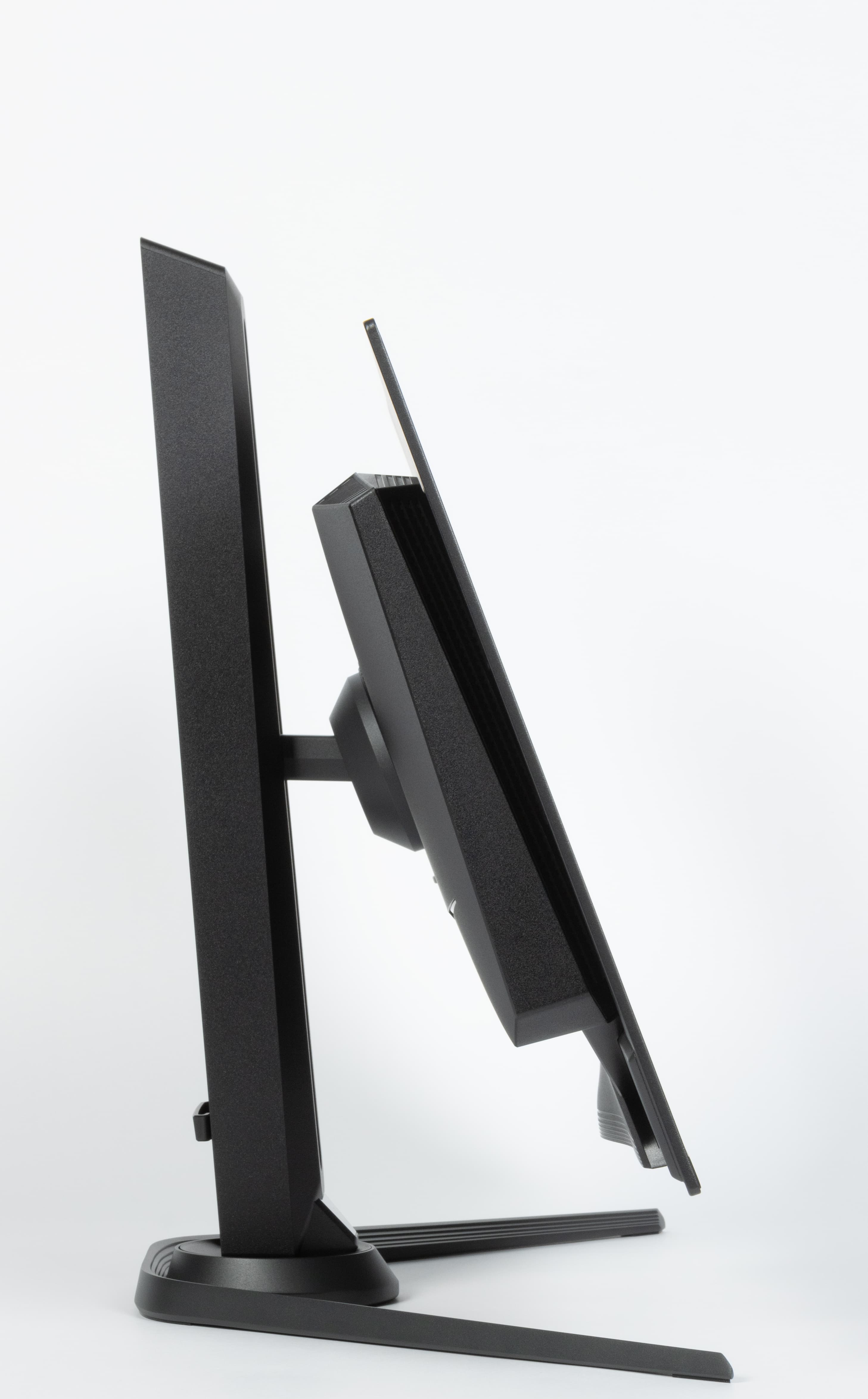 Стойка имеет фиксированную высоту, но подпираемый пружиной механизм со стальным рельсовым шариковым подшипником обеспечивает вертикальное перемещение шарнира, на который крепится блок экрана. В итоге легким движением руки экран можно установить на нужную высоту. Верхний шарнир позволяет немного наклонять блок экрана вперед от вертикального положения и больше наклонять назад, а также переворачивать в портретную ориентацию по часовой стрелке.