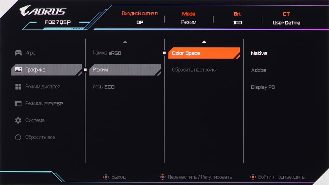 Присутствуют профили Display P3 и Adobe, в которых охват по возможности корректируется до охвата соответствующих пространств: