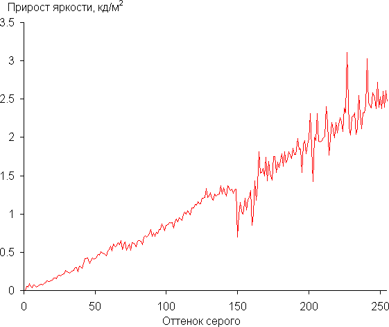 Для оценки характера роста яркости на шкале серого мы измерили яркость 256 оттенков серого (от 0, 0, 0 до 255, 255, 255) при значении настройки Гамма = Выкл. График ниже показывает скорость изменения (не абсолютное значение!) яркости между соседними полутонами:
